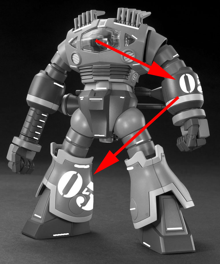 本体なら肩、前掛け(スカート)、ふくらはぎ付近。装備で言えば盾、プロペラントタンクやブースター、大体このぐらいではないでしょうか。